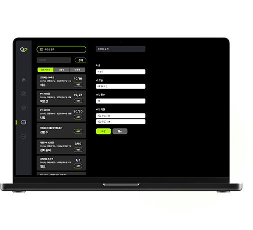 직관적인 UI를 통한 일일별 수업 일정 관리 회원별 수강권 정보 및 회차 모니터링
